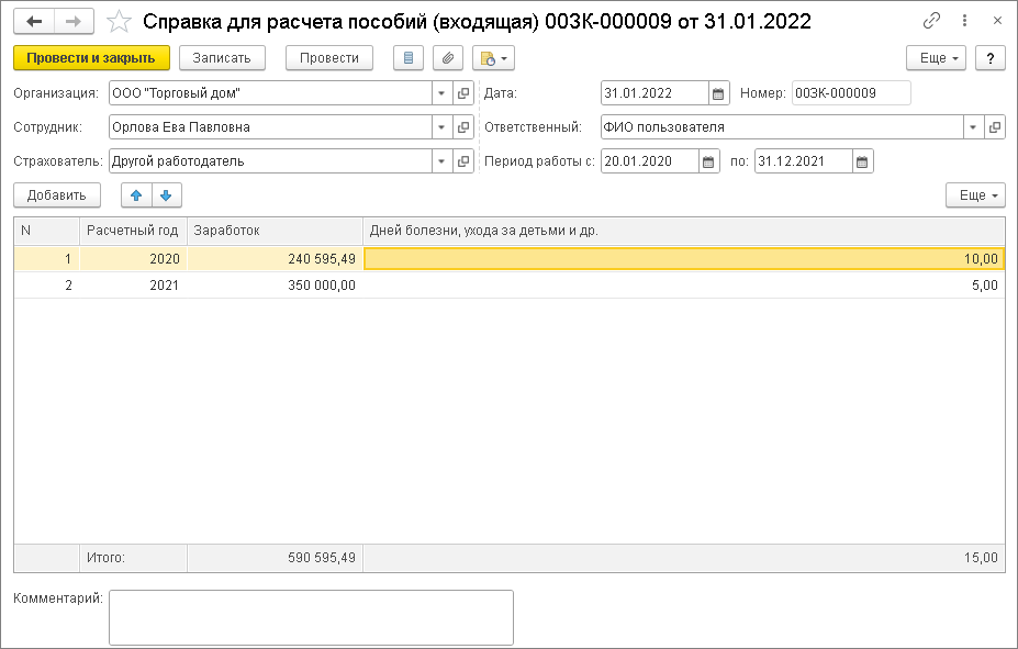 - В поле "Сотрудник" выберите сотрудника, который представил справку о сумме заработка для расчета пособий (рис. 1).
