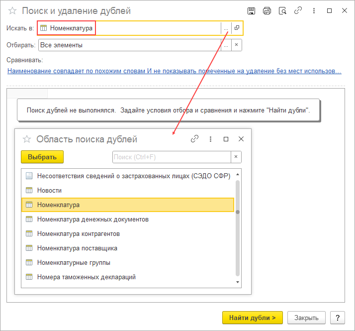 - В поле "Искать в" выберите необходимый справочник, например, "Номенклатура";