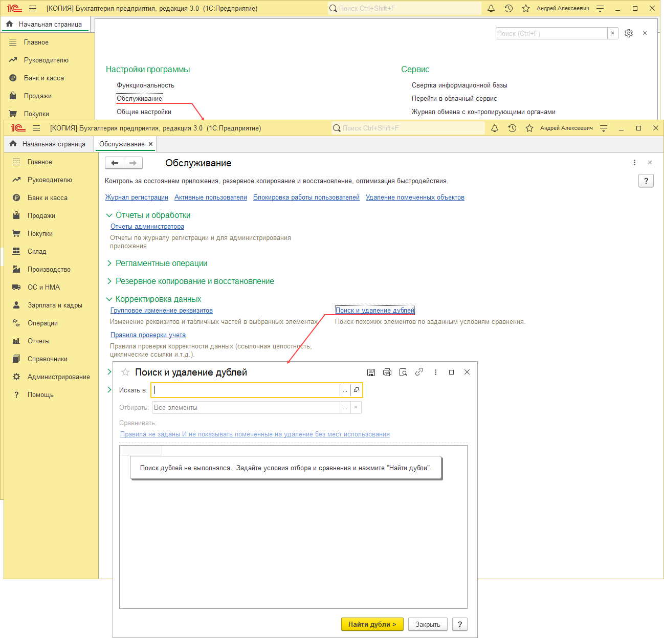 Для открытия и загрузки обработки "Поиск и удаление дублей" выполните следующие действия:
