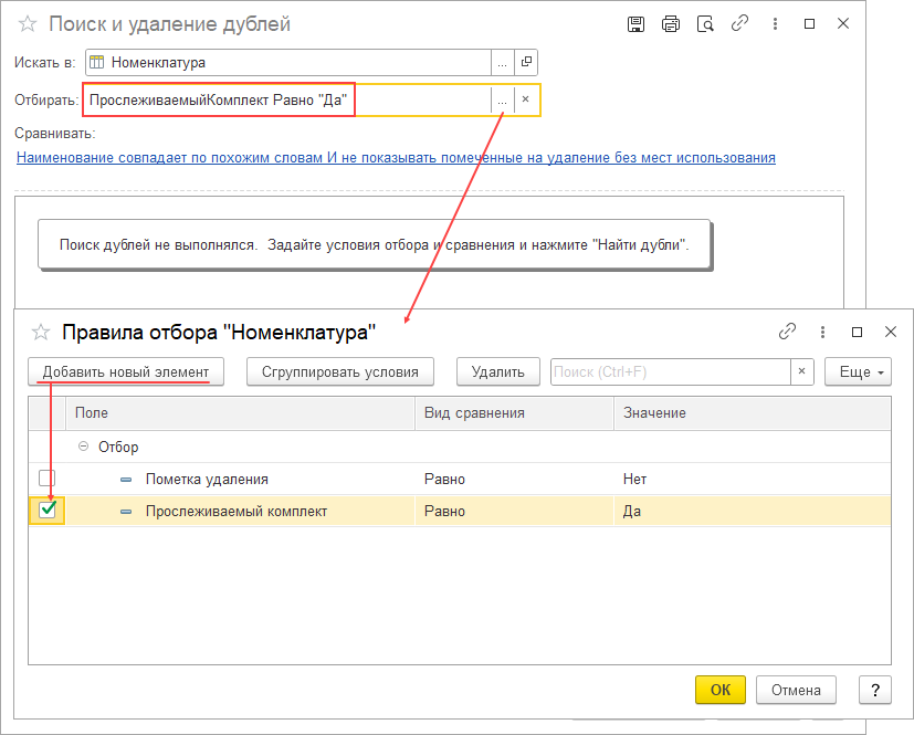 - Выберите в поле "Сравнивать" через существующую гиперссылку необходимое правило поиска дублей, установив нужный флажок.