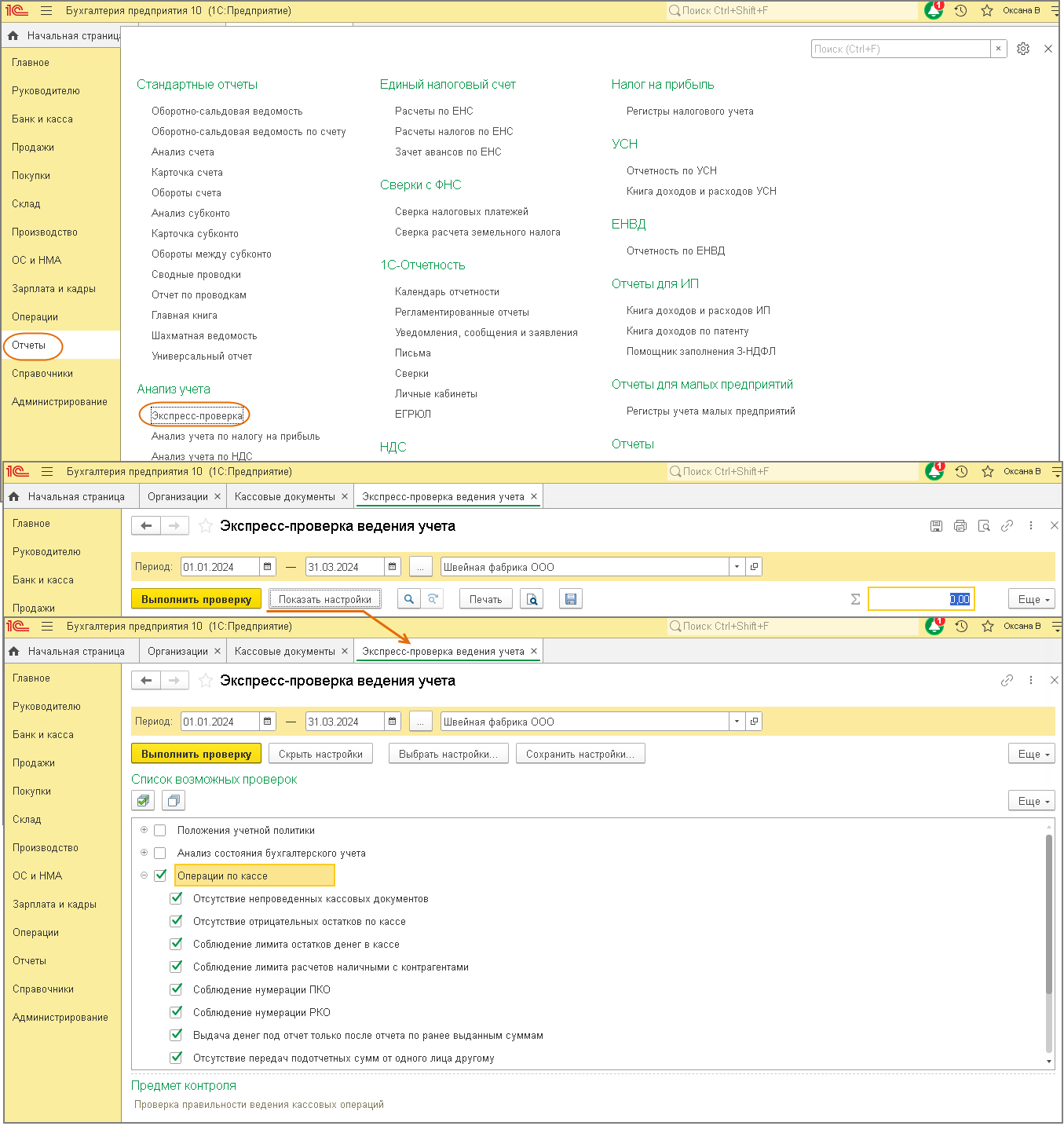 - Меню: Отчеты – Экспресс-проверка.