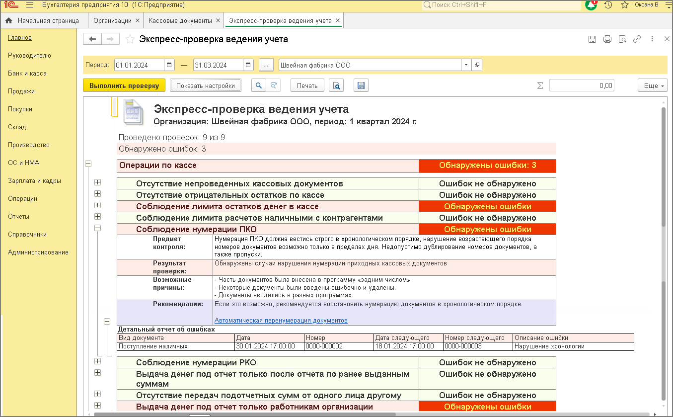 Для проверки соблюдения порядка ведения кассовых операций в программе "1С:Бухгалтерия 8" (ред. 3.0) реализован отчет "Экспресс-проверка", который включает проверку "Операции по кассе". Проверка проводится по девяти пунктам. Подробнее о каждом их них читайте в статье "Проверка кассовой дисциплины". После проверки формируется отчет с детализацией обнаруженных ошибок. Для проведения проверки сделайте следующее: