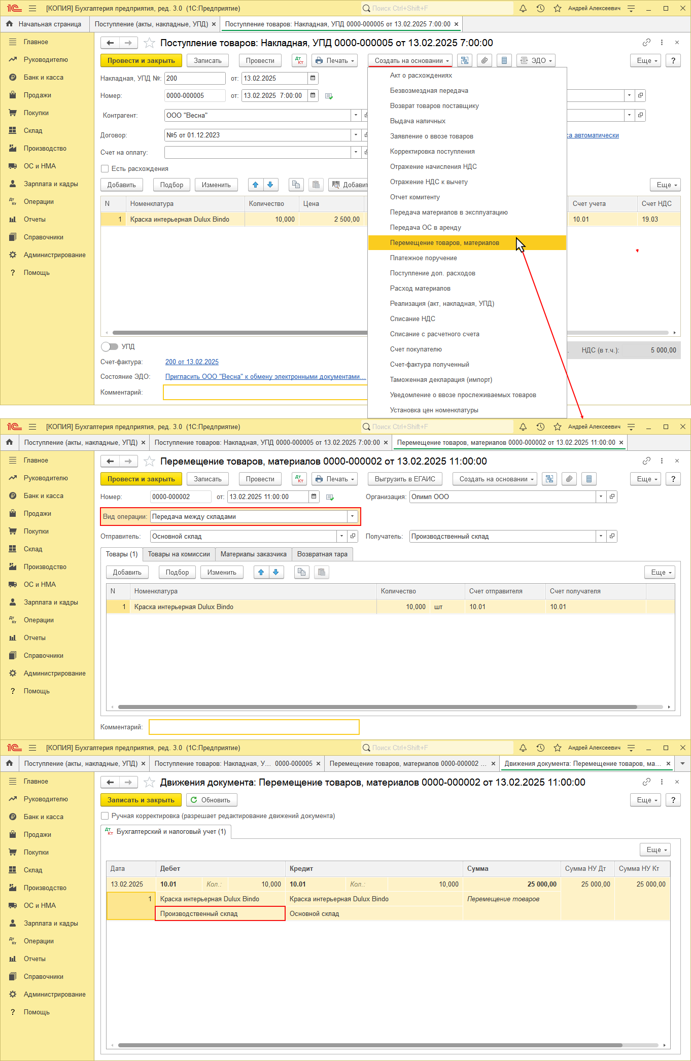 Чтобы отразить перемещение приобретенных товаров на другой склад, необходимо сделать следующее (рис. 1):